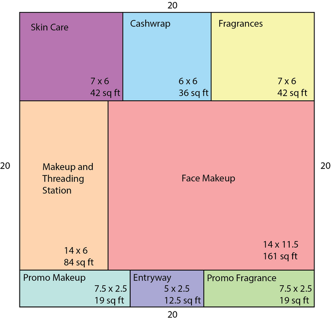 The floor plan for Éthéré is a 20 x 20 space designed for functionality and an exceptional customer experience. At its core is the Face Makeup Zone, a spacious 161 sq. ft. area showcasing a wide range of products. Surrounding it are the Makeup & Threading Station (84 sq. ft.), offering personalized services, and smaller zones like Skin Care and Fragrance, each occupying 42 sq. ft. These areas ensure an immersive and organized layout for exploring different product categories. The Promo Makeup, Promo Fragrance, and Entryway zones, totaling 50.5 sq. ft., highlight new launches and promotions, while the centrally located Cashwrap (36 sq. ft.) provides a functional yet aesthetically pleasing checkout experience. Together, these zones are strategically arranged to create an intuitive flow and engage customers effectively.